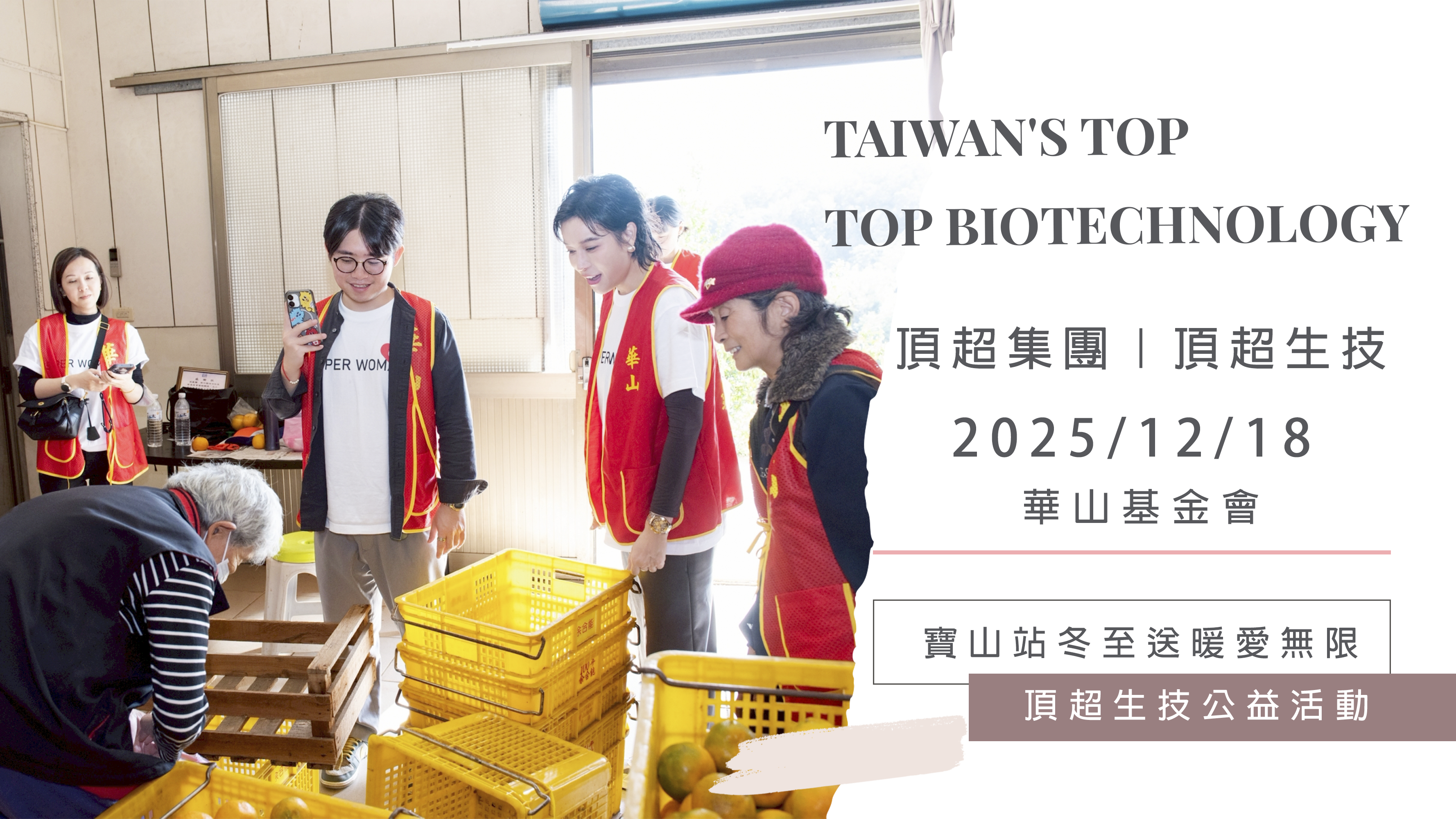這一年,是 超老闆孔文 與華山基金會寶山愛心天使站同行的 第六年。一路走來,這份陪伴從來不只是一次活動,而是一條持續走下去的路。從探視山區獨居長輩、中秋認購柚子禮盒,到冬至搓湯圓、過年前準備年菜,頂超生技 一直用實際行動,把「取之於社會,用之於社會」落實成真正看得見的付出。