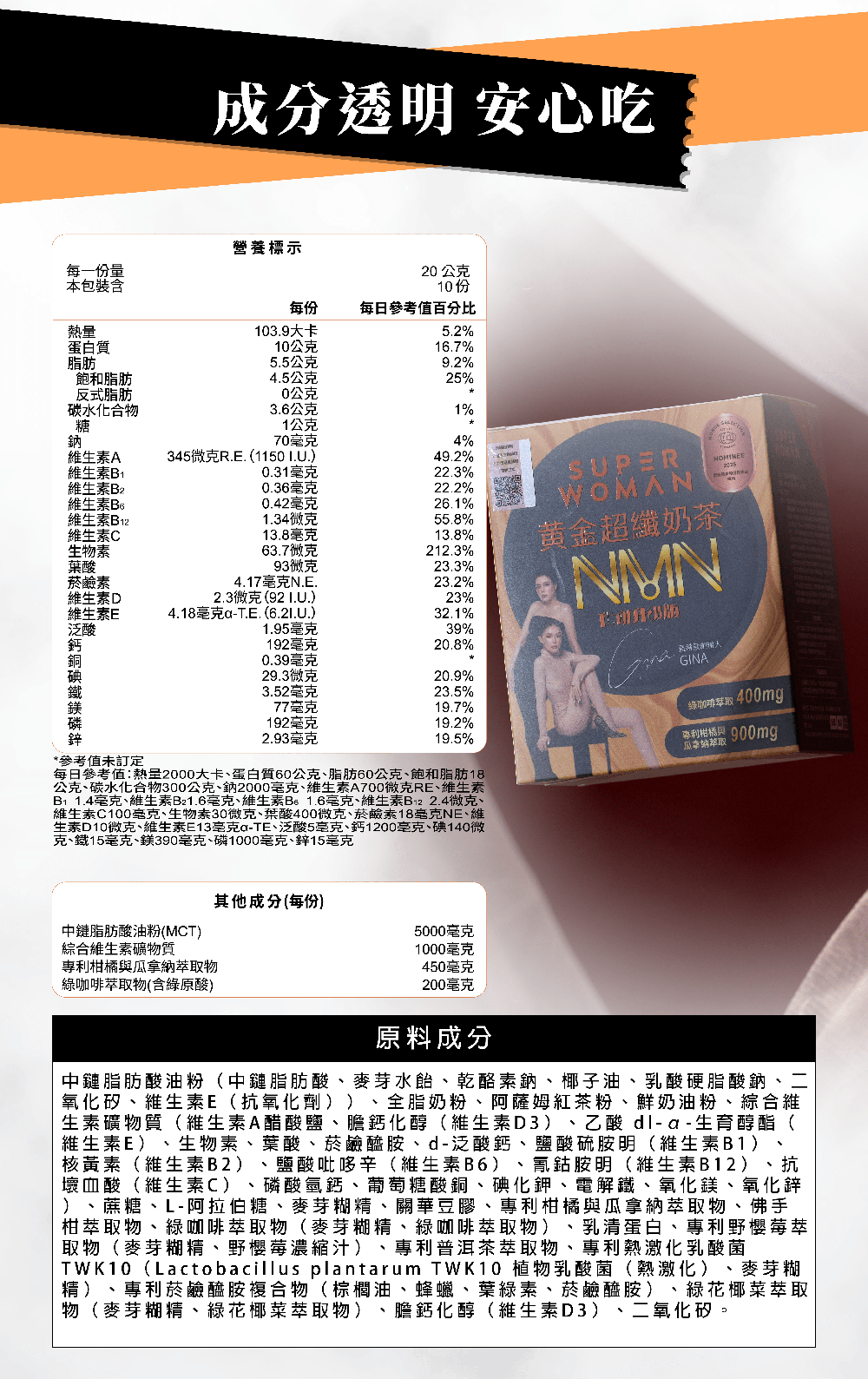 ● 主要成分:BBPS乳酸菌/專利柑橘與瓜拿納/專利普洱茶/專利野櫻莓/專利菊苣纖維/專利NADH+/維生素D3/綠咖啡萃取物/綜合維生素礦物質/綠花椰菜萃取物(NMN)