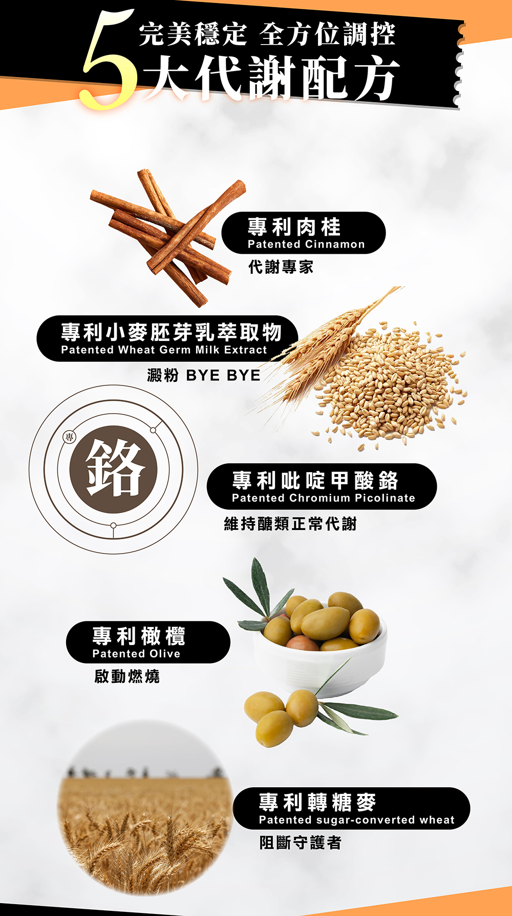 ●主要成分:專利肉桂/專利小麥胚芽萃取物/專利吡啶甲酸鉻/專利橄欖/專利轉糖麥